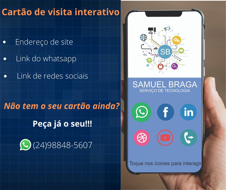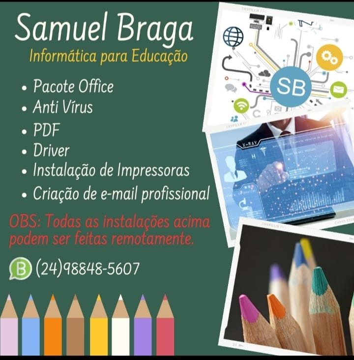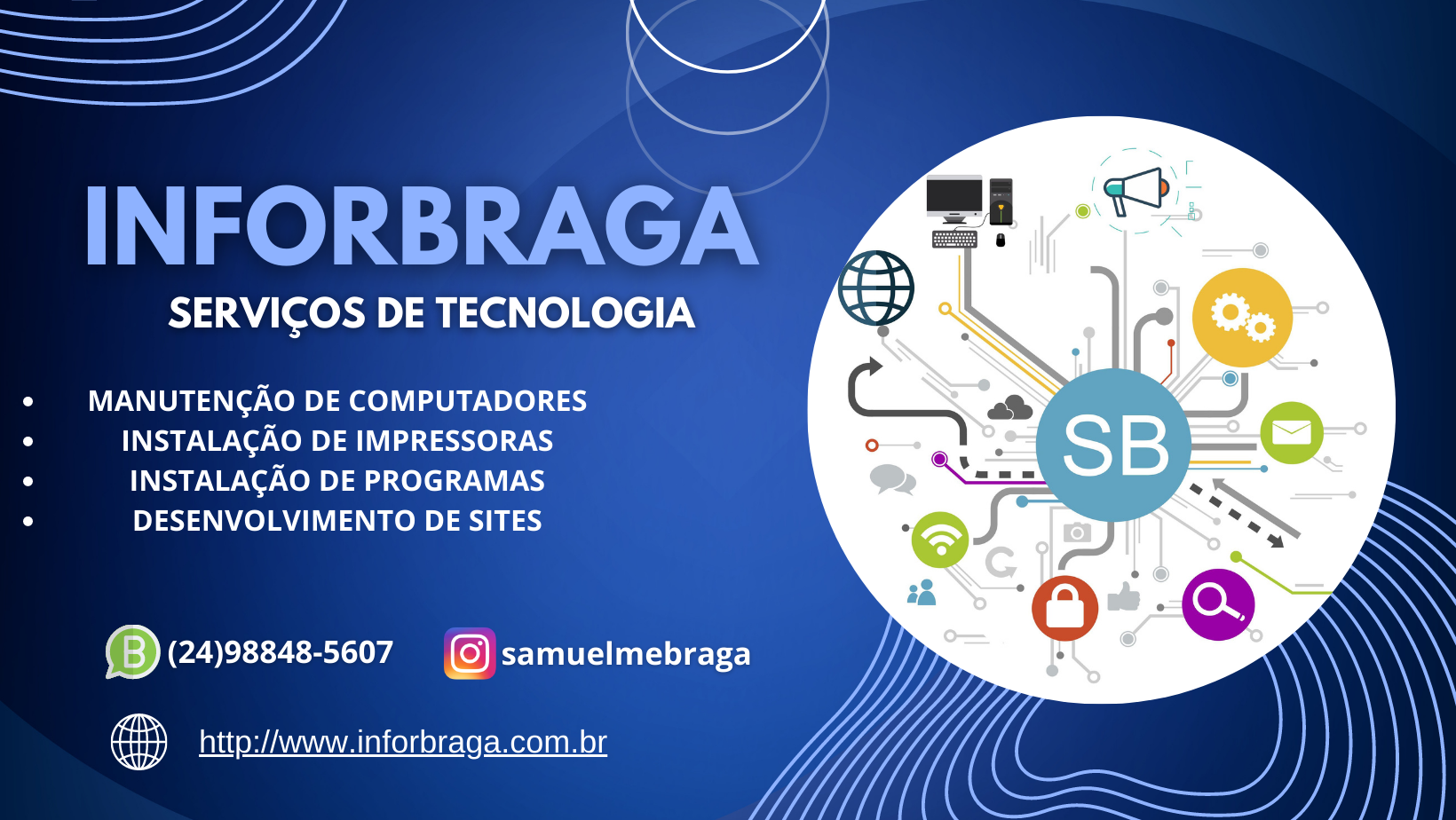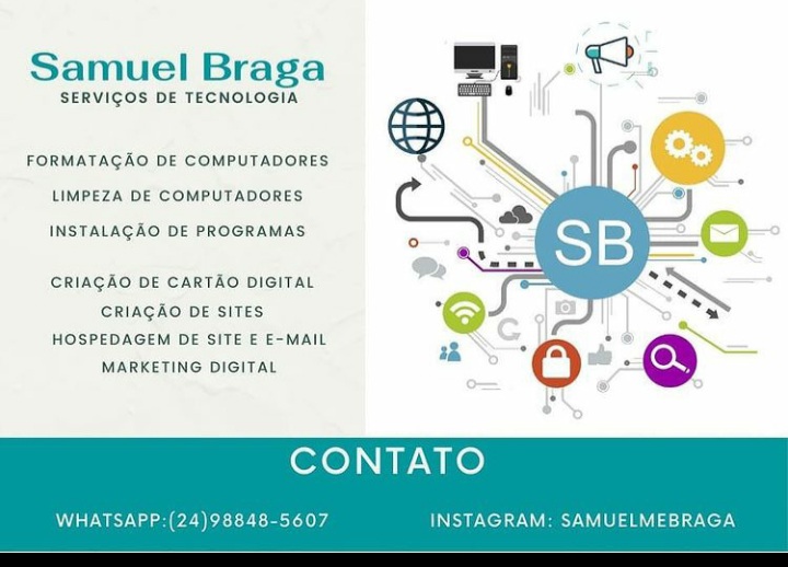 Trabalho com informática há mais de 15 anos, estou aqui para lhe oferecer os serviços de tecnologia, entre eles: Manutenção de notebook e computadores, Desenvolvimento de sites, hospedagem de site e e-mails, Softwares ERP, Catão de visita digital, aulas particulares de informática básica, venha conferir os meus trabalhos!
